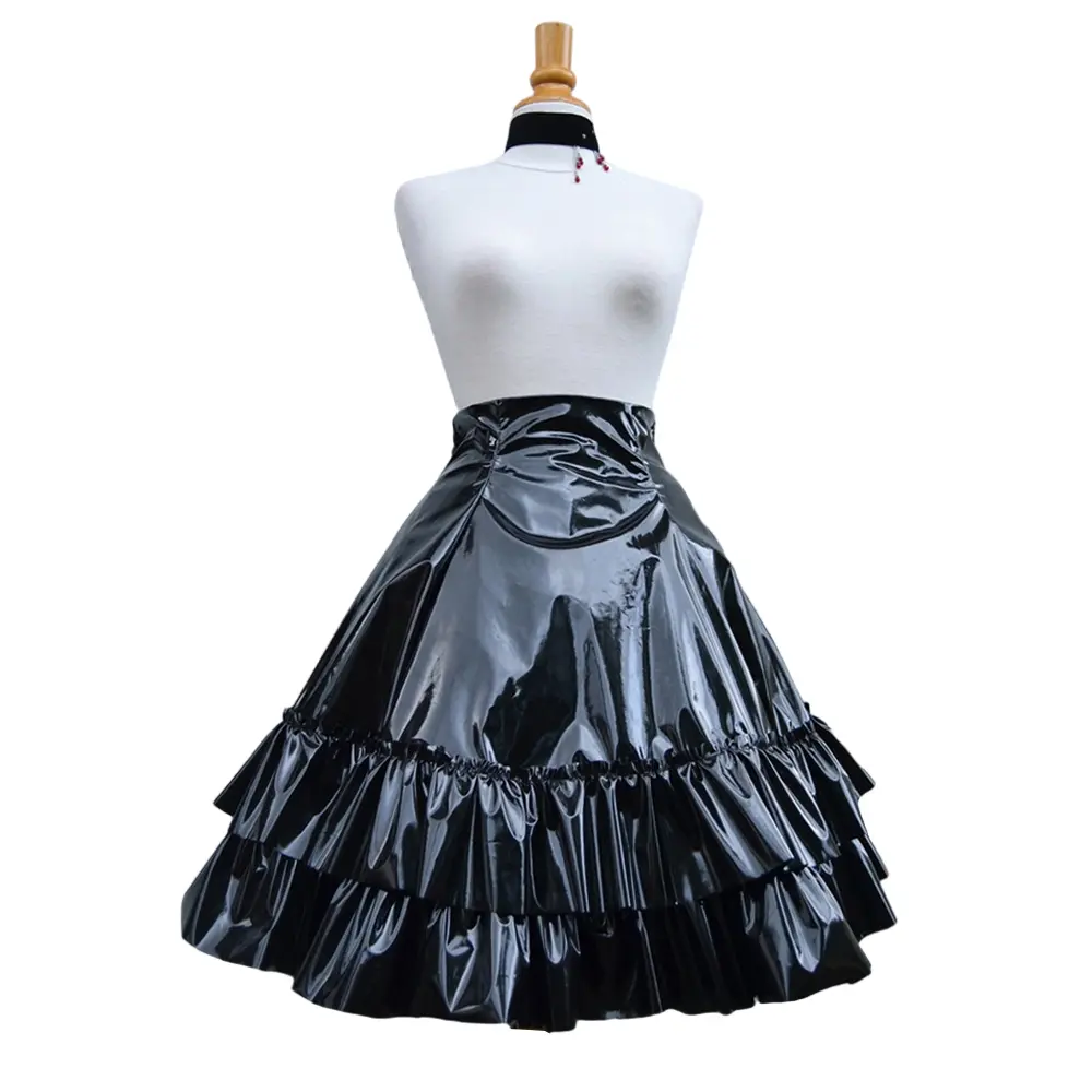 Vintage Shiny PVC Leather Ruffle Hem Long Trumpet Pleated Skirt